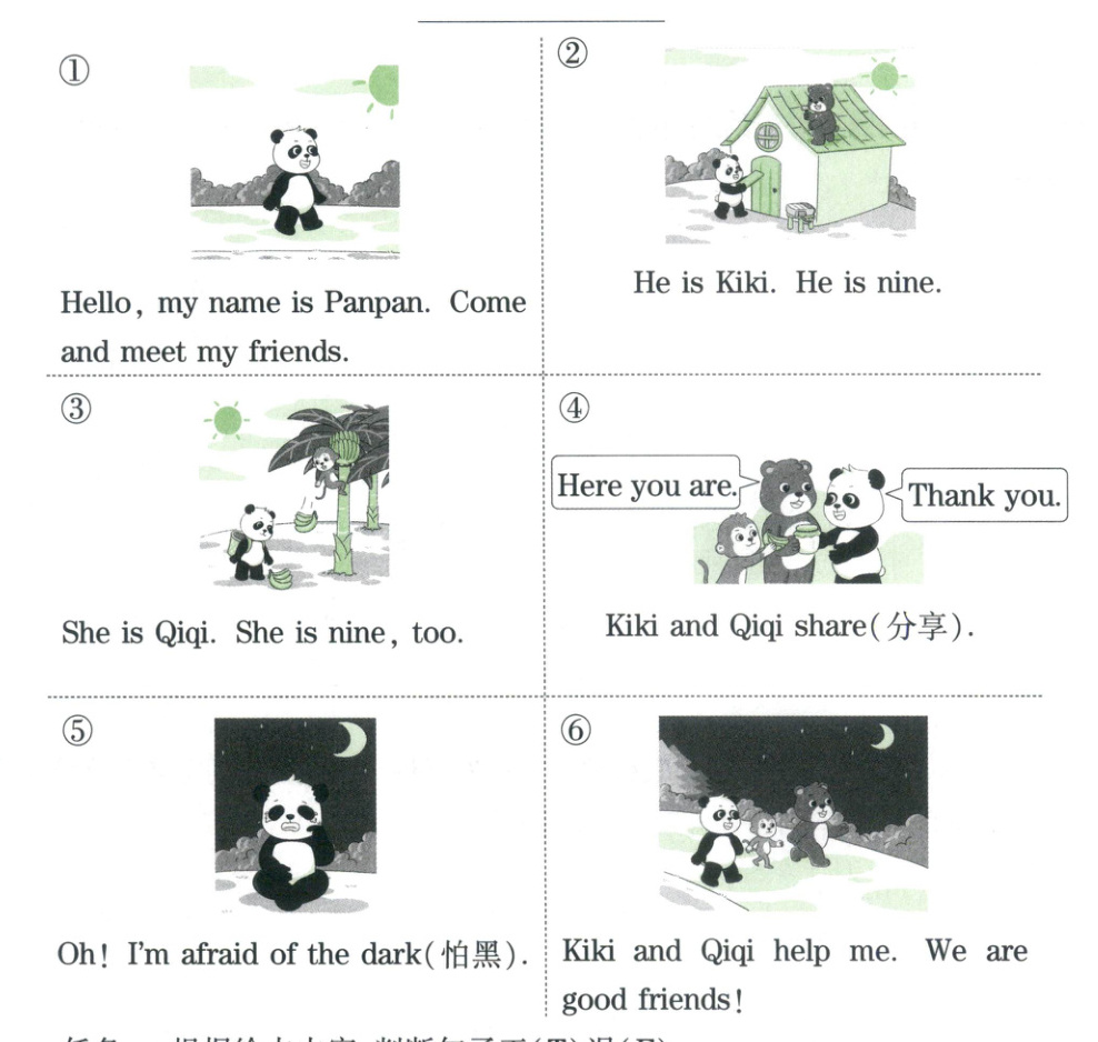 四、熊猫 Panpan 有两个好朋友,他们互相帮助,共同成长。阅读绘本,完成下列任务。