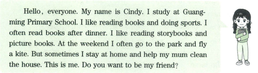 1. T 【解析】短文的第三句表明,Cindy在光明小学上学,由此可知,Cindy 是一名小学生,本题描述正确。