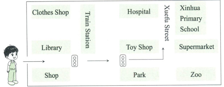 四、〔新题型〕假如你是 Li Hua,放学路上有人问你新华小学怎么走,你能根据图片提示为他指路吗?请填入适当的内容,补全对话。(每空一词)