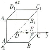 4. (教材 $ P_{18} \ T_3 $ 改编)已知 $ ABCD - A_1B_1C_1D_1 $ 是棱长为 $ 2 $ 的正方体,$ E,F $ 分别为 $ BB_1 $ 和 $ DC $ 的中点,建立如图所示的空间直角坐标系,试写出 $\overrightarrow{DB_1},\overrightarrow{DE},\overrightarrow{DF}$ 的坐标。