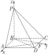 如图,在四棱锥$P - ABCD$中,$PB\perp底面ABCD$,底面$ABCD是边长为2$的菱形,$\angle ABC = 120^{\circ}$,$F为CD$的中点,$PB = 2$,以$B$为坐标原点,$\overrightarrow{BA}的方向为x$轴的正方向,建立如图所示的空间直角坐标系。