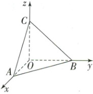 4. (教材 $ P_{29}T_3 $ 改编)如图所示,在三棱锥 $ O - ABC $ 中建立空间直角坐标系,$ O(0, 0, 0) $,$ A(a, 0, 0) $,$ B(0, b, 0) $,$ C(0, 0, c) $,其中 $ abc \neq 0 $,求平面 $ ABC $ 的一个法向量。