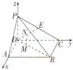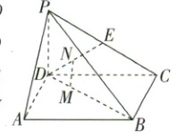 则$A(1,0,0)$,$P(0,0,1)$,$N(0,\frac{1}{2},\frac{1}{4})$,$M(\frac{1}{4},\frac{1}{2},0)$,所以$\overrightarrow{AP}=(-1,0,1)$,$\overrightarrow{MN}=(-\frac{1}{4},0,\frac{1}{4})$,所以$\overrightarrow{MN}=\frac{1}{4}\overrightarrow{AP}$,又$M$,$N∉AP$,故$MN// AP$。方法二:由题意可得,$\overrightarrow{MN}=\overrightarrow{MD}+\overrightarrow{DN}=\frac{1}{4}\overrightarrow{BD}+\frac{1}{2}\overrightarrow{DE}=\frac{1}{4}\overrightarrow{BD}+\frac{1}{2}×\frac{1}{2}(\overrightarrow{DC}+\overrightarrow{DP})=\frac{1}{4}\overrightarrow{BD}+\frac{1}{4}\overrightarrow{DC}+\frac{1}{4}\overrightarrow{DP}=\frac{1}{4}\overrightarrow{BC}+\frac{1}{4}\overrightarrow{DP}=\frac{1}{4}(\overrightarrow{AD}+\overrightarrow{DP})=\frac{1}{4}\overrightarrow{AP}$,又$M$,$N∉AP$,所以$MN// AP$。