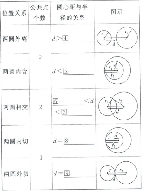提示:公共点个数有0个、1 个及2个的情况,其中当公共点个数为0 时,位置关系有外离和内含;当公共点个数为1时,位置关系有外切和内切;当公共点个数为2时,位置关系为相交.