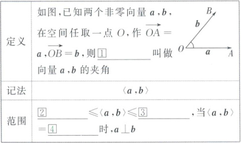 【解析】:空间向量的夹角:已知两个非零向量$\boldsymbol{a}$,$\boldsymbol{b}$,在空间任取一点$O$,作$\overrightarrow{OA}=\boldsymbol{a}$,$\overrightarrow{OB}=\boldsymbol{b}$,则$\angle AOB$叫做向量$\boldsymbol{a}$,$\boldsymbol{b}$的夹角,记作$\langle\boldsymbol{a},\boldsymbol{b}\rangle$。规定:$0\leqslant\langle\boldsymbol{a},\boldsymbol{b}\rangle\leqslant\pi$。当$\langle\boldsymbol{a},\boldsymbol{b}\rangle=0$时,$\boldsymbol{a}$与$\boldsymbol{b}$同向;当$\langle\boldsymbol{a},\boldsymbol{b}\rangle=\pi$时,$\boldsymbol{a}$与$\boldsymbol{b}$反向;当$\langle\boldsymbol{a},\boldsymbol{b}\rangle=\frac{\pi}{2}$时,称$\boldsymbol{a}$与$\boldsymbol{b}$互相垂直,记作$\boldsymbol{a}\perp\boldsymbol{b}$。