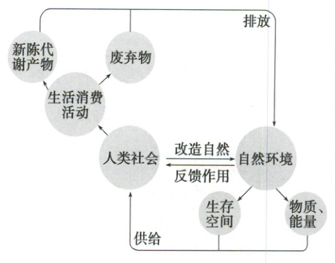 人类社会与自然环境互相依存、互相影响,它们之间的关系主要体现在两个方面:一方面,人类的生存和发展依赖自然环境;另一方面,人类可以改造环境,环境又反作用于人类。人类若能正确处理好与环境的关系,环境就会向有益于人类生存的良性方向发展;反之,如果人类采取不适当的生产和生活方式,就会破坏大自然在漫长进化过程中形成的生态平衡,导致环境恶化,使人类生活质量下降,甚至危及人类的生存。下图示意人类社会与自然环境之间的相互关系。