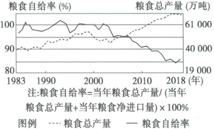 (2022·天津等级考)粮食生产是保障我国粮食安全的重要环节。目前我国粮食供求总量平衡,解决了全国人民吃饭问题,取得了举世瞩目的巨大成就,同时也出现了一些新现象。下图是1983—2018年我国粮食总产量和自给率变化图。据此完成第3题。