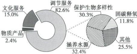 (2023·浙江1月选考)生态系统生产总值(GEP)是指生态系统能够为人类生活和社会发展提供的最终产品与服务价值的总和,由物质产品、调节服务和文化服务构成。2019年海南热带雨林国家公园GEP高达2045亿元,其各项价值量占比下图所示。据此完成1~2题。