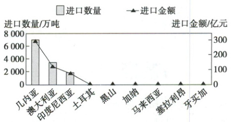 (2024·福建龙岩高二校考阶段练习) 我国的铝土矿资源产量居世界第二位,广泛用于国防、航空、汽车、电器等领域之中,进口量在2012年以后快速上涨。2022年,我国铝土矿对外依存度高达59%。下图示意2022年中国铝土矿进口来源状况。据此完成1~2题。