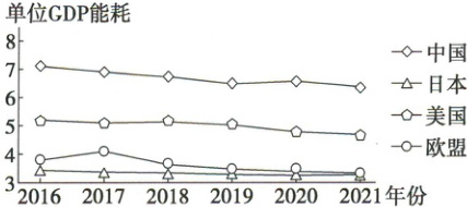 (2024·贵州贵阳高二校联考)单位GDP能耗,是指一定时期内一个国家(地区)每生产一个单位的国内(地区)生产总值所消耗的能源。下图示意世界四个主要经济体单位GDP能耗对比。据此完成1~2题。