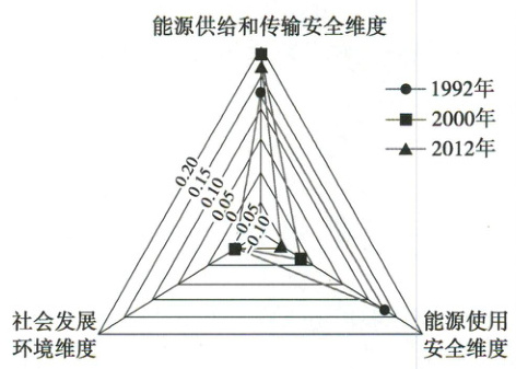 能源安全包括能源供给和传输安全维度、能源使用安全维度和社会发展环境维度三个方面。下图示意我国1992年、2000年和2012年能源安全表现。据此完成3~4题。