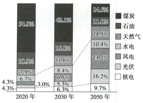 据统计,2022年我国已成为世界第一炼油大国,炼油总产能达到9.2亿吨/年,原油进口5.08亿吨,对外依存度达71.2%。下图为2020—2050年我国能源消费结构示意图(含预测)。据此完成3~4题。