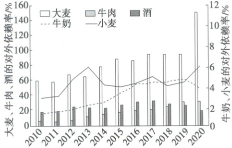 (2024·湖北武汉高二校联考期中) 近年来,我国对国际食物进口依赖风险不断变化。下图示意 2010—2020 年我国 5 种食物的对外依赖率。据此完成 1~2 题。