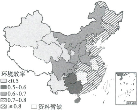 (2024 · 吉林白城高二校考期末)环境效率与国家环境安全密切相关。环境效率高,说明现有技术条件下污染物可减少的程度比较低,此时只有通过进一步提高技术水平才能更大幅度地减少污染物排放;环境效率低,说明即使不提高技术水平,也可以通过充分利用现有技术而大幅度减少污染物的排放,从而改善环境质量。读某年我国各省级行政区环境效率分布示意图,完成1~2题。
