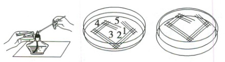 一只手拿着培养皿,另一只手拿着接种环在平板上操作;平板划线示意图(共5个区域);平板划线后的培养皿。