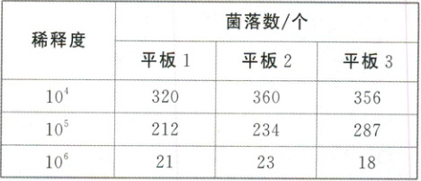 (5)某同学在三种稀释度下吸取0.1mL的菌液涂布平板,统计菌落数,得到以下数据,则1g样品中的活菌数约为