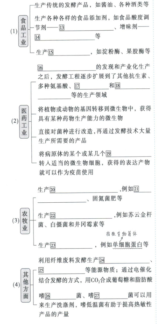 ⑩温和 ⑪丰富 ⑫污染小 ⑬柠檬酸 ⑭谷氨酸钠 ⑮酶制剂 ⑯青霉素 ⑰激素 ⑱免疫调节剂 ⑲抗原基因 ⑳微生物肥料 ㉑根瘤菌肥 ㉒微生物农药 ㉓微生物饲料 ㉔酒精 ㉕乙烯 ㉖热 ㉗盐