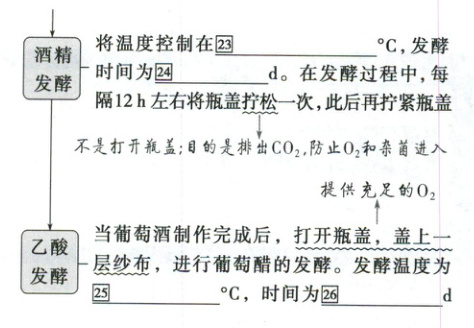 ⑯植物体表面 ⑰5%~20% ⑱八成 ⑲盐水 ⑳野生酵母菌 ㉑70%的酒精 ㉒1~2 ㉓18~30 ㉔10~12 ㉕30~35 ㉖7~8