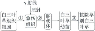解析:选C。题图中诱变过程依据的原理是基因突变,植物组织培养过程依据的原理是植物细胞具有全能性,A正确;过程①(脱分化)一般不需要光照,过程②(再分化)需要适宜的光照,B正确;因为愈伤组织经γ射线照射后发生了基因突变,再分化为胚状体,因此白三叶草组织细胞和胚状体的细胞中DNA和RNA的种类不完全相同,C错误;过程③是在个体水平上进行筛选的,方法是用除草剂喷洒白三叶草幼苗,D正确。