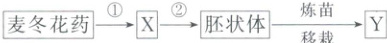 解析:选B。题图中X和Y分别表示愈伤组织和单倍体幼苗,A正确;需要对培养基及操作工具进行灭菌处理,但不能对麦冬花药进行灭菌处理,B错误;题图中①和②过程所用培养基中激素的比例不同,C正确;麦冬花药离体培养的过程体现了生殖细胞具有全能性,D正确。