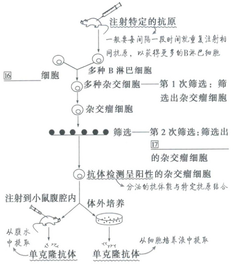 ⑩抗体 ⑪血清 ⑫特异性差 ⑬增殖 ⑭大量增殖 ⑮特定抗体 ⑯能分泌所需抗体 ⑰抗原 ⑱抗原 ⑲同位素或荧光标记 ⑳肿瘤抗原 ㉑治疗疾病