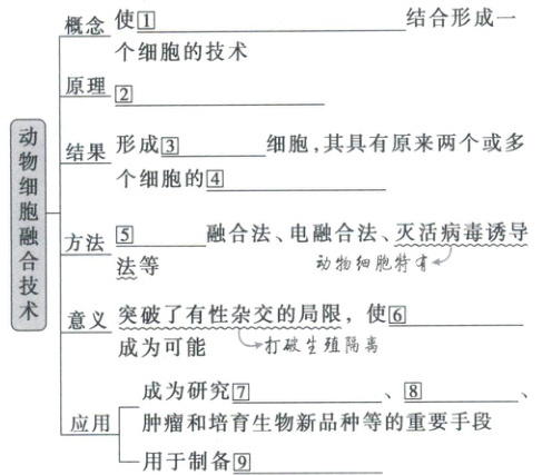 ①两个或多个动物细胞 ②细胞膜的流动性 ③杂交 ④遗传信息 ⑤PEG ⑥远缘杂交 ⑦细胞遗传 ⑧细胞免疫 ⑨单克隆抗体