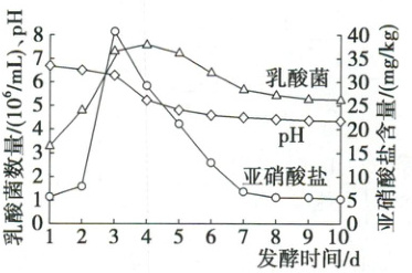 2. (教材 P8“拓展应用”T2 改编) 某生物兴趣小组探究了泡菜制作过程中乳酸菌数量、$pH$以及亚硝酸盐含量的变化,结果如下图所示。下列有关叙述错误的是(