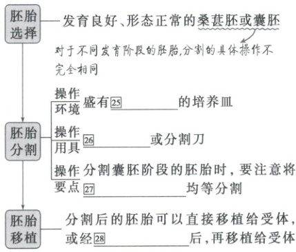 将早期胚胎切割成 2 等份、4 等份或 8 等份等,经移植获得㉒同卵双胎