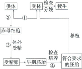 2. (教材 P61 图 2 - 23 改编)下图为牛胚胎移植的流程图,其中①~④表示相应的操作过程。下列叙述正确的是(