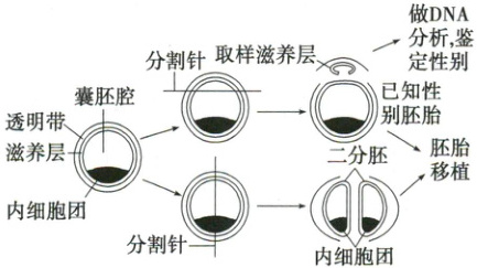 (3)囊胚的内细胞团将来发育成胎儿的各种组织,滋养层发育成胎盘和胎膜。取滋养层细胞做DNA分析鉴定性别,不会影响胎儿的发育。