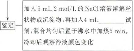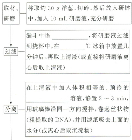 (2)①研磨不充分会使细胞核内的 DNA 释放不完全,提取的 DNA 量变少,导致看不到白色丝状物,最终用二苯胺试剂鉴定不显示蓝色或蓝色很浅。 ②DNA 不溶于酒精,加入预冷的酒精溶液有利于 DNA 析出。 ③搅拌时玻璃棒不能直插烧杯底部,搅拌要轻缓,并沿一个方向搅拌。玻璃棒沿着一个方向轻缓搅拌可防止丝状 DNA 被破碎,使 DNA 完整地缠在玻璃棒上。 ④2 次。将 DNA 和杂质分子分开。第1次操作后,DNA 存在于上清液中;第2次操作后,DNA 存在于析出的白色丝状物或离心管管底的沉淀中。