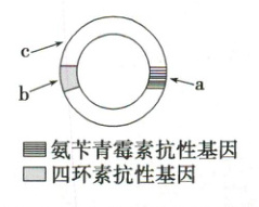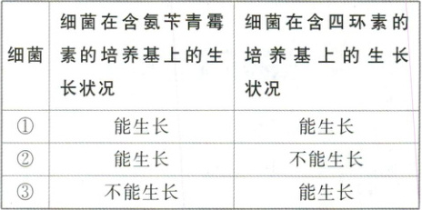 解析:选 A。①细菌能在含氨苄青霉素和四环素的培养基上生长,说明其氨苄青霉素抗性基因和四环素抗性基因都没有被破坏,所以插入点是 c;②细菌能在含氨苄青霉素的培养基上生长,而不能在含四环素的培养基上生长,说明其氨苄青霉素抗性基因正常表达而四环素抗性基因被破坏,故插入点为 b;③细菌不能在含氨苄青霉素的培养基上生长,能在含四环素的培养基上生长,说明其氨苄青霉素抗性基因被破坏而四环素抗性基因正常表达,故插入点为 a,故 A 符合题意。