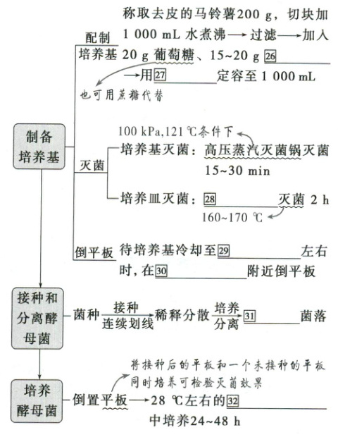 ⑱单一个体 ⑲纯培养物 ⑳固体培养基 ㉑肉眼 ㉒菌落 ㉓平板划线 ㉔稀释涂布平板 ㉕纯培养物 ㉖琼脂 ㉗蒸馏水 ㉘干热灭菌箱 ㉙95℃ ㉚酒精灯火焰 ㉛单 ㉜恒温培养箱