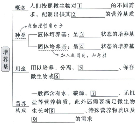 ①营养物质 ②生长繁殖 ③液体 ④固体 ⑤鉴定 ⑥积累其代谢物 ⑦氮源 ⑧pH ⑨O₂
