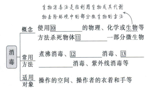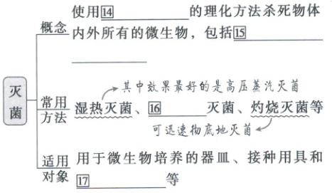 ⑩较为温和 ⑪表面或内部 ⑫巴氏 ⑬化学药物 ⑭强烈 ⑮芽孢和孢子 ⑯干热 ⑰培养基