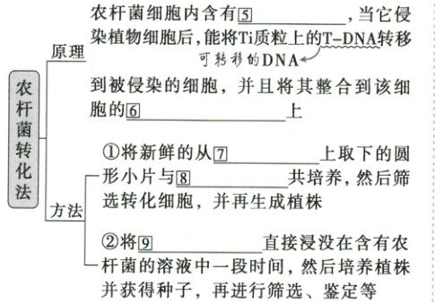 (2)⑤Ti质粒 ⑥染色体DNA ⑦叶片 ⑧农杆菌 ⑨花序 3. ⑩显微注射 4. ⑪${Ca^{2+}}$