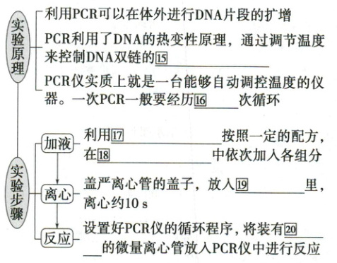1. ⑮解聚与结合 ⑯30 ⑰微量移液器 ⑱微量离心管 ⑲离心机 ⑳反应液 2.