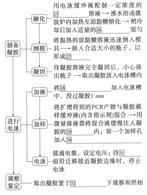 (2)㉕琼脂糖 ㉖核酸染料 ㉗加样孔 ㉘电泳缓冲液 ㉙加样孔 ㉚指示分子大小的标准参照物 ㉛指示剂 ㉜紫外灯