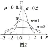 的变化而沿 $x$ 轴平移,如图 1.(7) 当 $\mu$ 一定时,正态曲线的形状由 $\sigma$ 确定,当 $\sigma$ 较小时,峰值高,正态曲线“瘦高”,表示随机变量 $X$ 的分布比较集中;当 $\sigma$ 较大时,峰值低,正态曲线“矮胖”,表示随机变量 $X$ 的分布比较分散,如图 2.