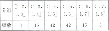 某公司采购了一批零件,为了检测这批零件是否合格,从中随机抽测了120个零件的长度(单位:dm),按数据分成[1.2,1.3],(1.3,1.4],(1.4,1.5],(1.5,1.6],(1.6,1.7],(1.7,1.8]这6组,得到如下的频数分布表。