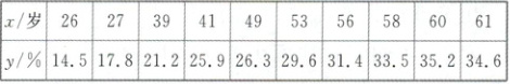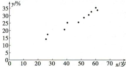 (对接教材例1)科研人员在对人体脂肪含量 $ y $ 和年龄 $ x $ 之间关系的研究中,获得了一些年龄和脂肪含量的简单随机样本数据,如下表: