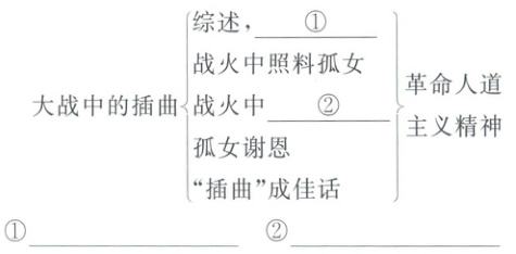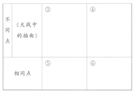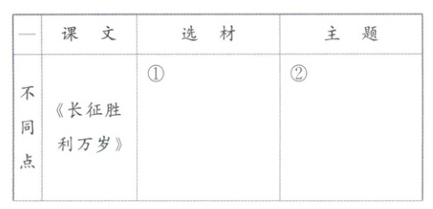 选材上:相同点是⑤都与战争有关;不同点是一篇文章①选择长征胜利这一伟大事件,另一篇文章③选择小事件,即百团大战中救助日本小姑娘的故事。主题上:相同点是⑥都表达了对中国革命的认识和思考;不同点是一篇文章②展现对长征胜利的喜悦和自豪之情,另一篇文章④反映中国人民、中国军队在残酷战争中对革命人道主义的坚守。