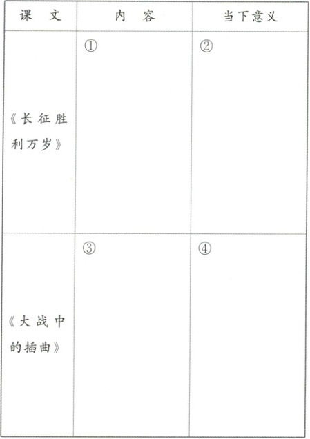 ①记叙了红军胜利到达陕北、歼灭敌军、召开全军干部会议等事件。会议上毛主席对长征过程和意义进行了总结 ②让我们认识到长征精神是中华民族百折不挠、自强不息的民族精神的最高表现,是保证我们革命和建设事业走向胜利的强大精神力量。激励当代青年继承和发扬长征精神 ③课文讲述了聂荣臻元帅在百团大战中救助了两个日本孤女并将其送还日方的故事以及由此产生的中日人民友好佳话 ④让我们认识到中华民族是一个热爱和平、有人道主义精神的民族;同时也认识到和平的重要性