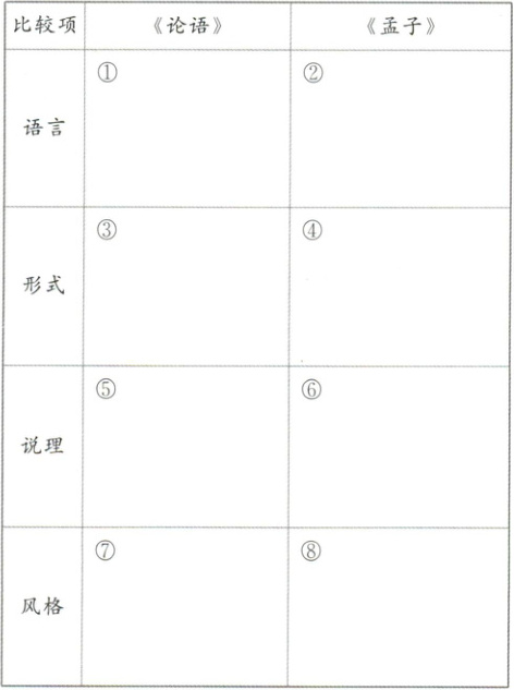 2.比较《论语》孟子》在语言、形式、说理、风格方面的特点,完成下面的表格。