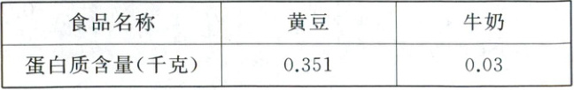 2. 蛋白质是人体必需的营养物质,在日常生活中需要注意高蛋白质食物的摄入。下表是1千克黄豆和1千克牛奶中的蛋白质含量。1000千克黄豆和10千克牛奶中,蛋白质的含量分别是多少千克?(4分)