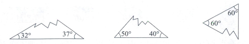 12. 下面的三角形都缺失了一个角,分别算一算缺失角的度数,并写出它们按角分是哪种三角形。