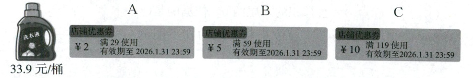 3. 某店铺推出洗衣液优惠活动(如图)。妈妈准备购买两桶洗衣液,可以领取哪张优惠券?需要支付多少元?(4分)