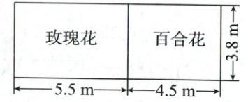 3.8×(5.5 + 4.5)=38(平方米) 3.8×5.5 - 3.8×4.5=3.8(平方米) 答:这块花圃的面积是38平方米,种玫瑰花的面积比种百合花的面积大3.8平方米。