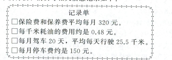 (1)□每千米耗油的费用约是0.48元。□每月驾车20天,平均每天行驶25.5千米。