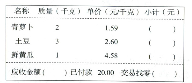 2. 小泽陪奶奶去超市买了一些蔬菜,电子购物小票如下,请你补全小票中的数据。(5分)